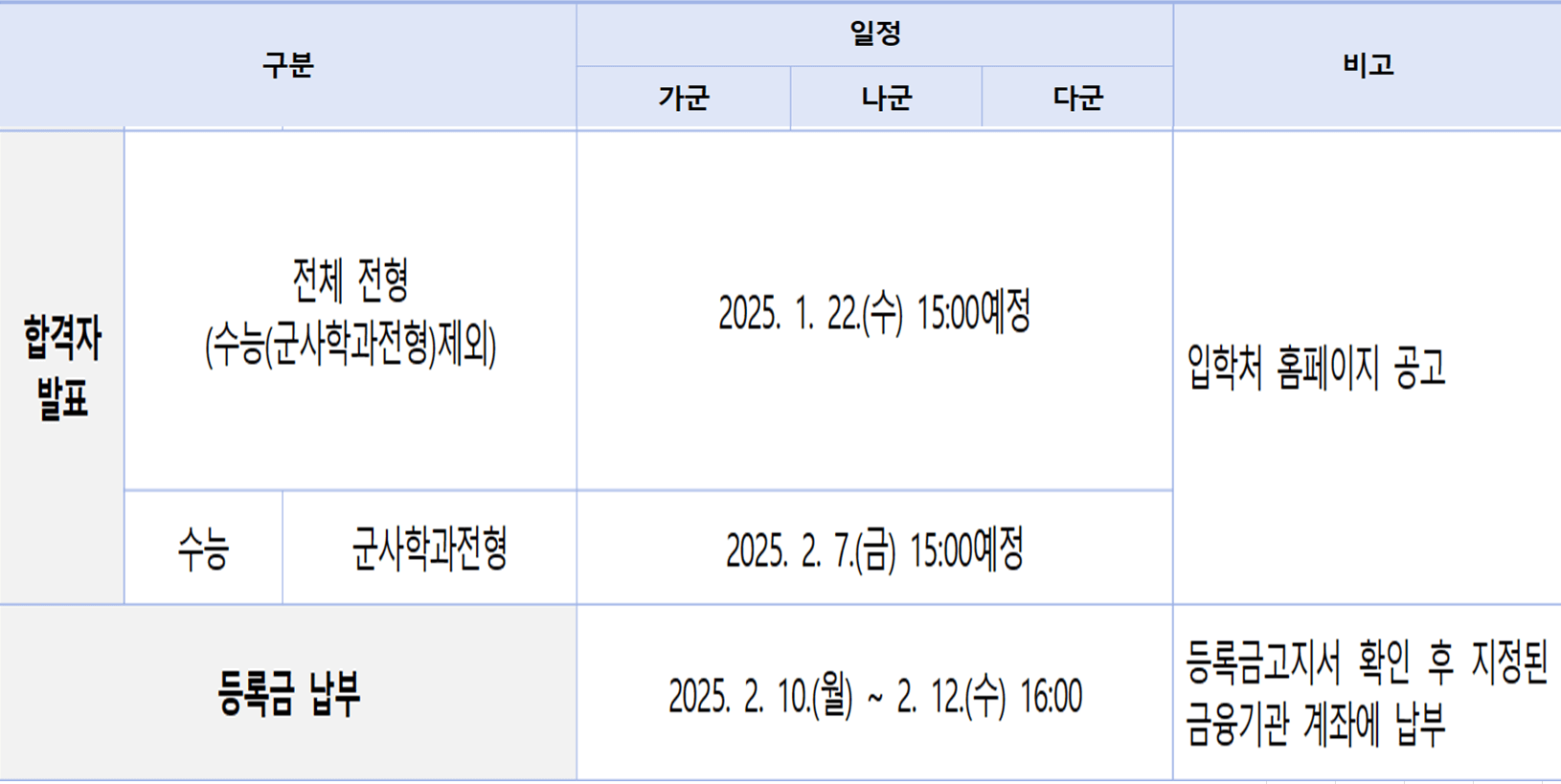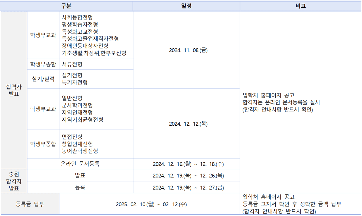 - 전체 전형[수능(군사학과전형)제외] : 2025. 1. 22.(수) 15:00 예정