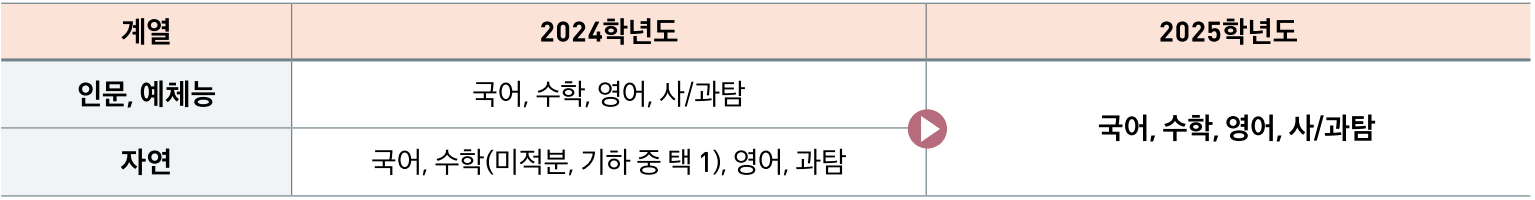 * 계열별 수능 응시영역 지정 해제 - 자연계열 수학 응시영역 제한 해제, 탐구 사/과탐 응시 가능 ![]() |