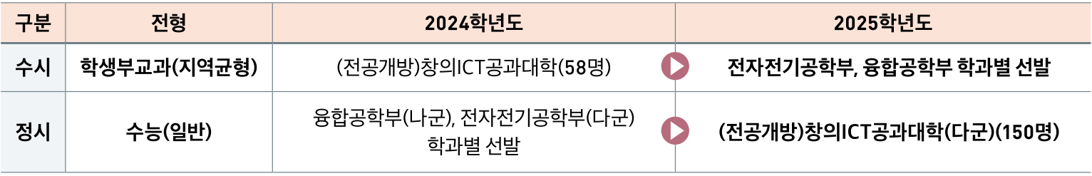 * 창의ICT공과대학 전공개방모집 정시 다군 선발 및 인원 확대 - 그 외 전공개방모집 모집단위(학과) 수시 학생부교과(지역균형) 선발 유지 ![]() |