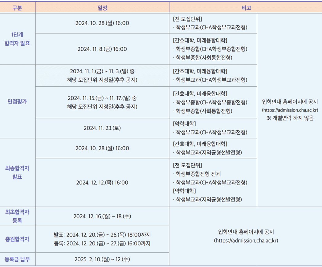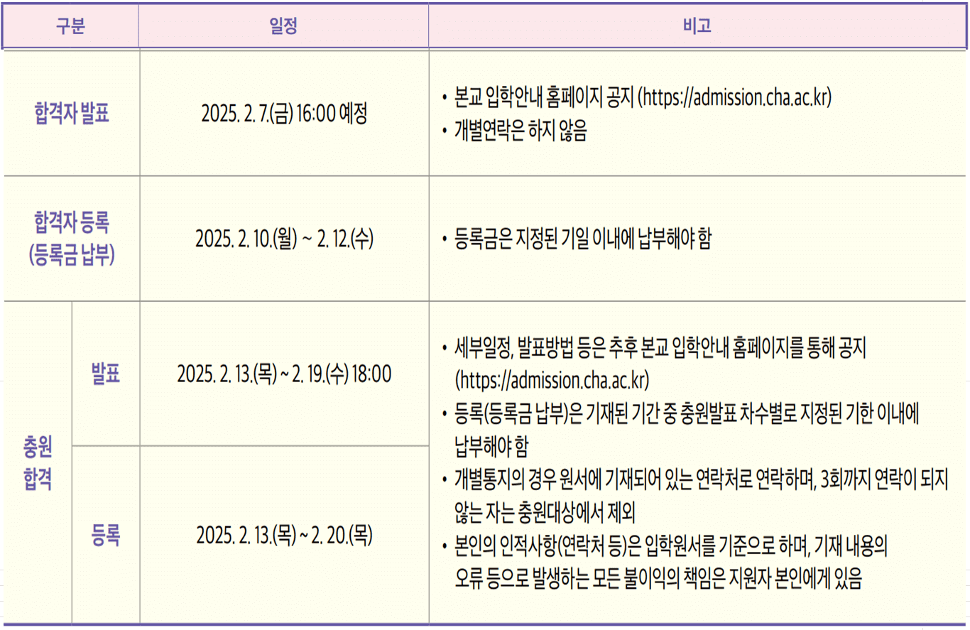| 합격자 발표 | 2025. 2. 7.(금) 16:00 예정 | * 차 의과학대 입학안내 홈페이지 공고 ( https://admission.cha.ac.kr ) * 개별연락은 하지 않음 |