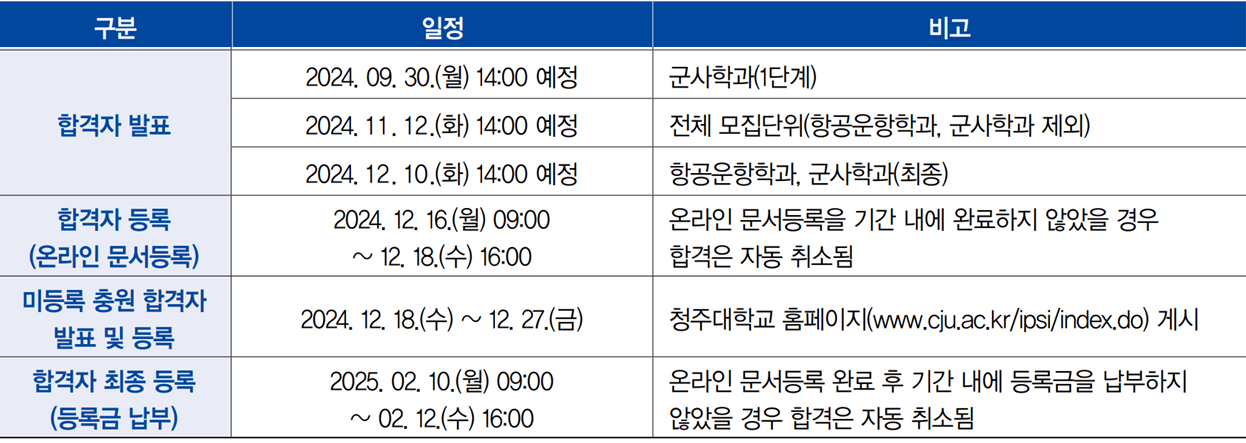 2025학년도 청주대 수시모집 합격자 발표일 및 충원(추가) 합격자 발표일 등을 안내해 드리도록 하겠습니다. 아래 일정을 참고하셔서 입학 등록에 차질이 없으시기 바랍니다.