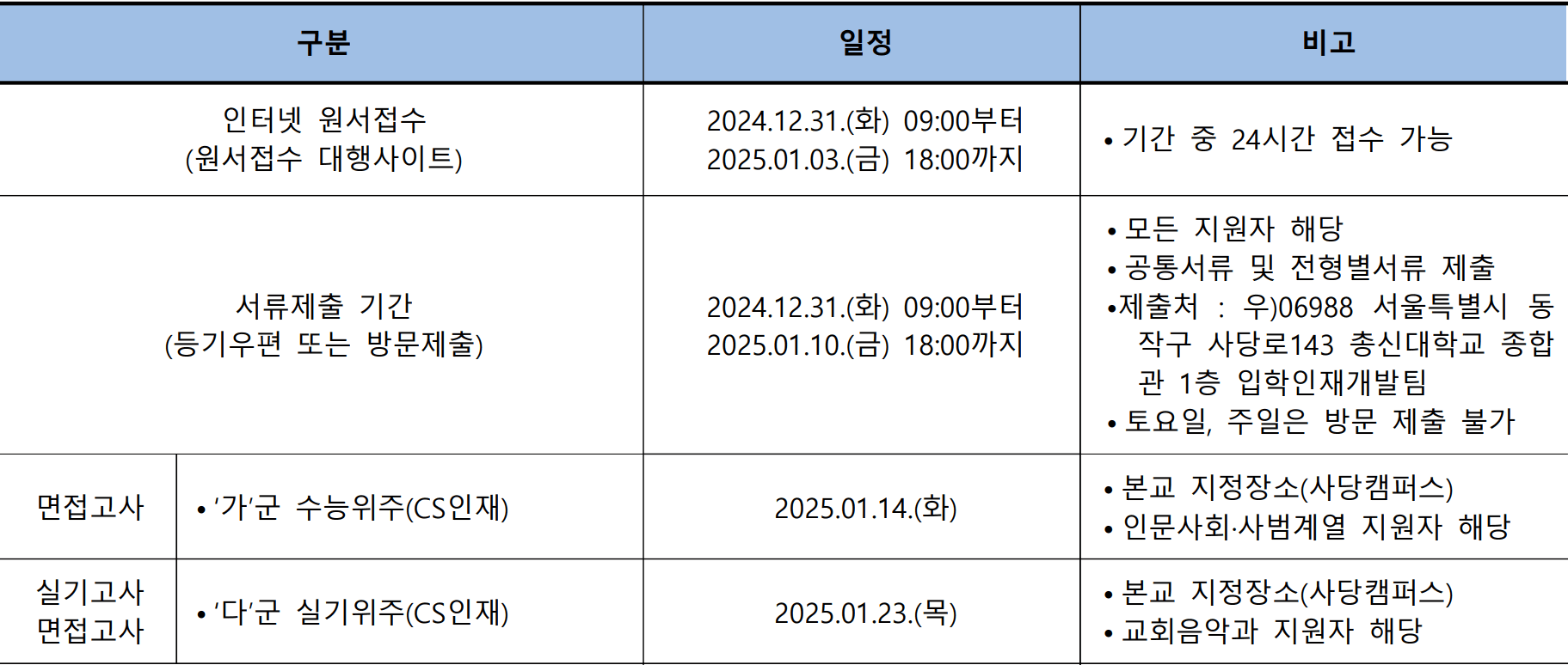 * 모든 지원자는 제출방법에 따라 공통서류 및 전형별 서류를 제출해야 함(2025.1.10.(금) 18:00까지 도착 필수) * 제출처 :우)06988 서울특별시 동작구 사당로 143 총신대학교 종합관 1층 입학인재개발팀 |