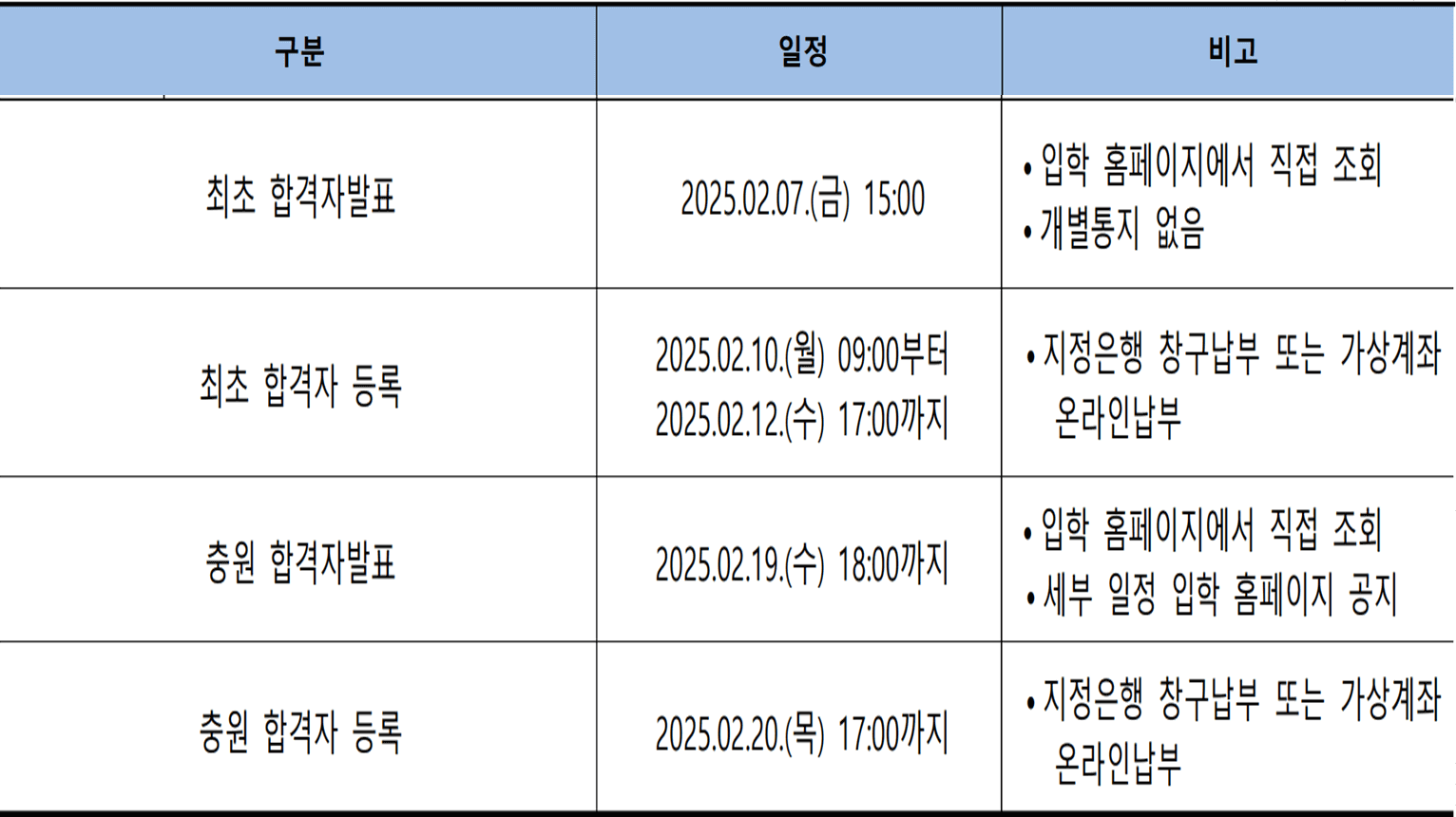 | 최초 합격자 예치금 등록 | 2024. 12. 16.(월) 09:00부터 2024. 12. 18.(수) 17:00까지 |