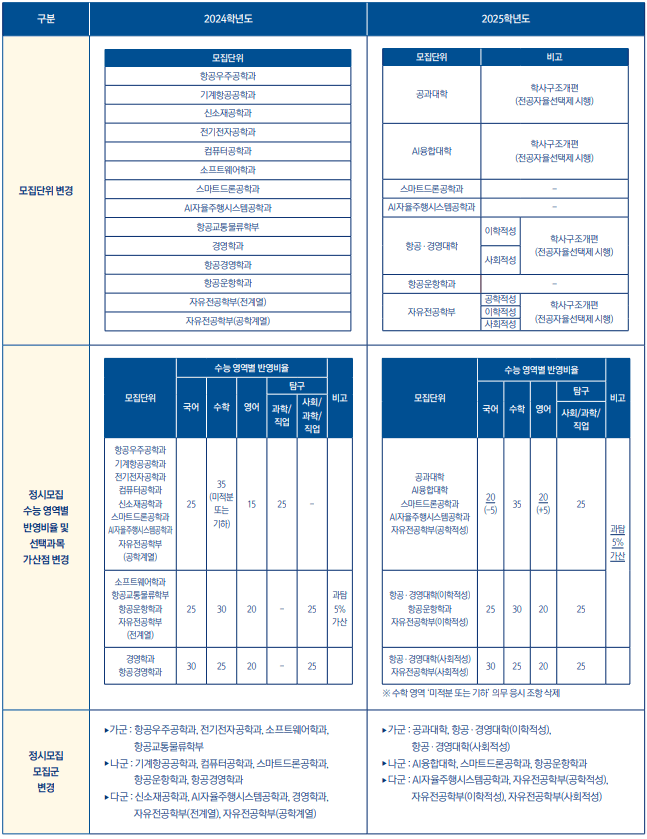 1952년 개교한 한국항공대학교는 국내 항공우주과학을 선도하는 대학으로서 지난 70년 동안 항공우주분야의 전문인력을 양성한다는 사명감으로 특성화의 길을 걸어왔습니다. 누리호 발사 성공 등 우리나라 항공우주산업이 선진국 수준으로 발전을 거듭하고, 세계 6위의 항공운송강국으로 성장할 수 것에는 개교 이후 지금까지 항공우주 관련 분야에서 인재를 양성하고 연구해 온 한국항공대의 역할이 컸다고 자부하고 있습니다. 한국항공대의 2025학년도 정시모집 합격자 발표 및 충원합격자 1차~4차(최종) 발표 조회, 정시모집 실시간 경쟁률, 수시모집 합격자 발표 및 충원(추가) 합격자 발표, 정시모집 원서접수일 및 서류제출, 정시모집요강, 정시모집 주요 변경사항, 모집군, 2024학년도 정시모집 경쟁률 및 입시결과, 정시 성적산출 프로그램, 전공소개, FAQ 및 Q&A 등에 대해서 알아보도록 하겠습니다.