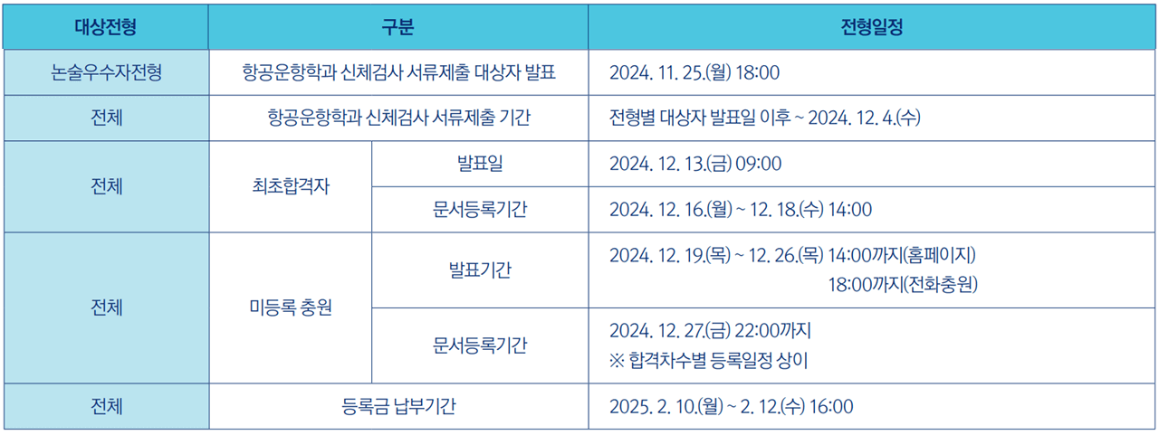 | 항공운항학과 신체검사 서류제출 | 대상자 발표 이후 ~ 2025. 1. 24.(금) 16:00 |