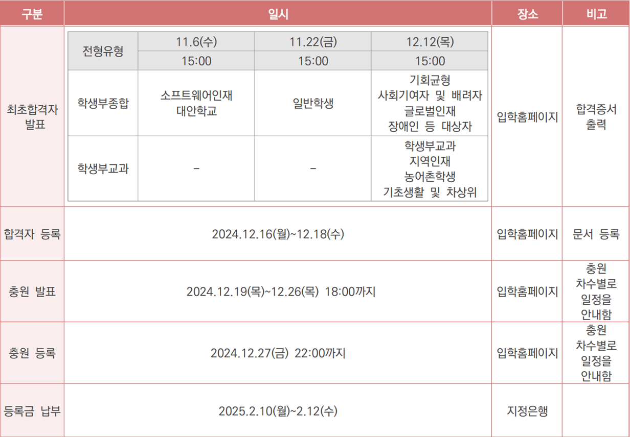 2025학년도 한동대 수시모집 합격자 발표일 및 충원(추가) 합격자 발표일 등을 안내해 드리도록 하겠습니다. 아래 일정을 참고하셔서 입학 등록에 차질이 없으시기 바랍니다.
