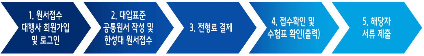 ● 한성대는 인터넷을 통해서만 원서를 접수하며, 원서접수 대행업체는 [유웨이]입니다. 원서접수 경로는 [본교 입학 홈페이지 https://enter.hansung.ac.kr]를 통하거나, [(주)유웨이 https://www.uwayapply.com]에 접속하여 해당 사이트의 안내에 따라 접수하기 바랍니다.