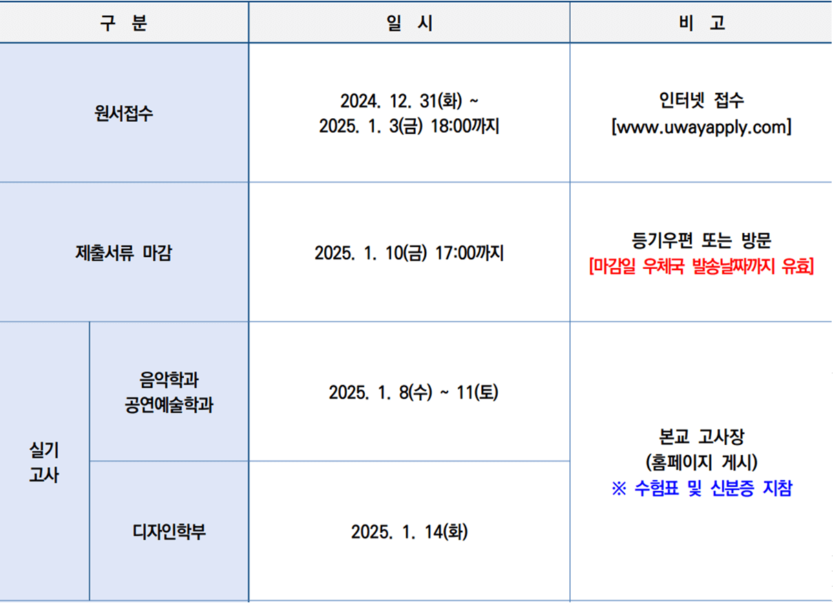 | 인터넷 원서접수 | 2024. 12. 31.(화) ~ 2025. 01. 03.(금) 18:00 까지 |