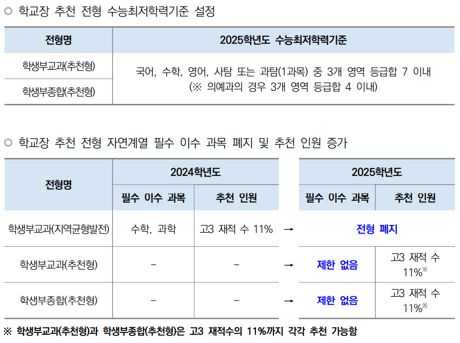 | 9월 19일(목) - 9월 25일(수) | 학생부교과(추천형), 학생부종합(추천형) | 학교장 추천 명단 입력 |