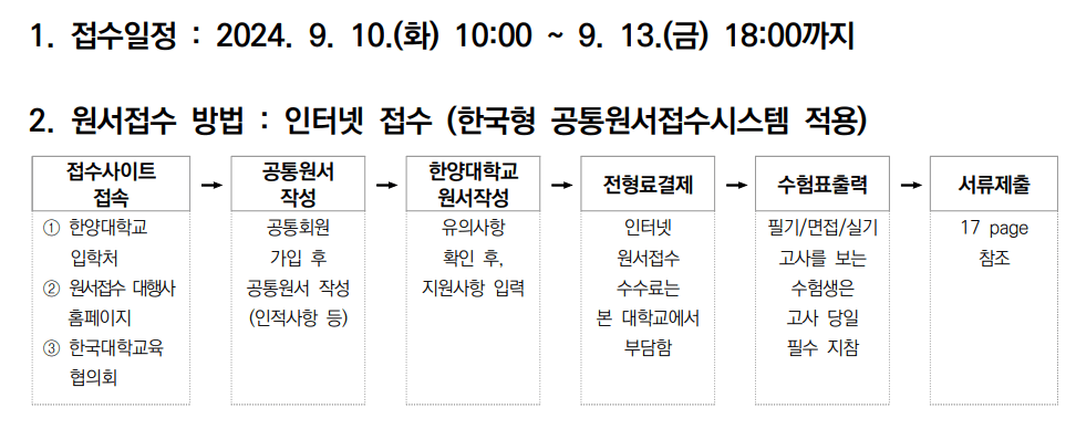 2025학년도 한양대 서울캠퍼스 수시모집 입학원서 접수일은 2025년 9월 10일(화) 오전 10시부터 9월 13일(금) 오후 6시까지입니다.