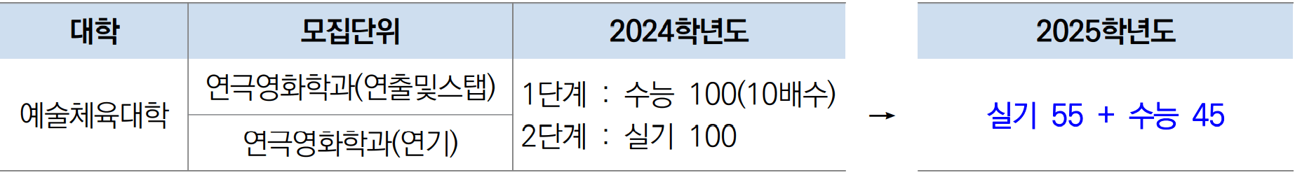 ● 정시 <가>군 연극영화학과(연출 및 스텝, 연기) 단계별 전형에서 일괄합산 전형으로 변경
