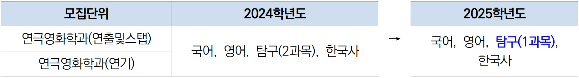 ● 정시 <가>군 연극영화과(연출 및 스텝, 연기) 수능 반영영역(필수 응시영역) 변경