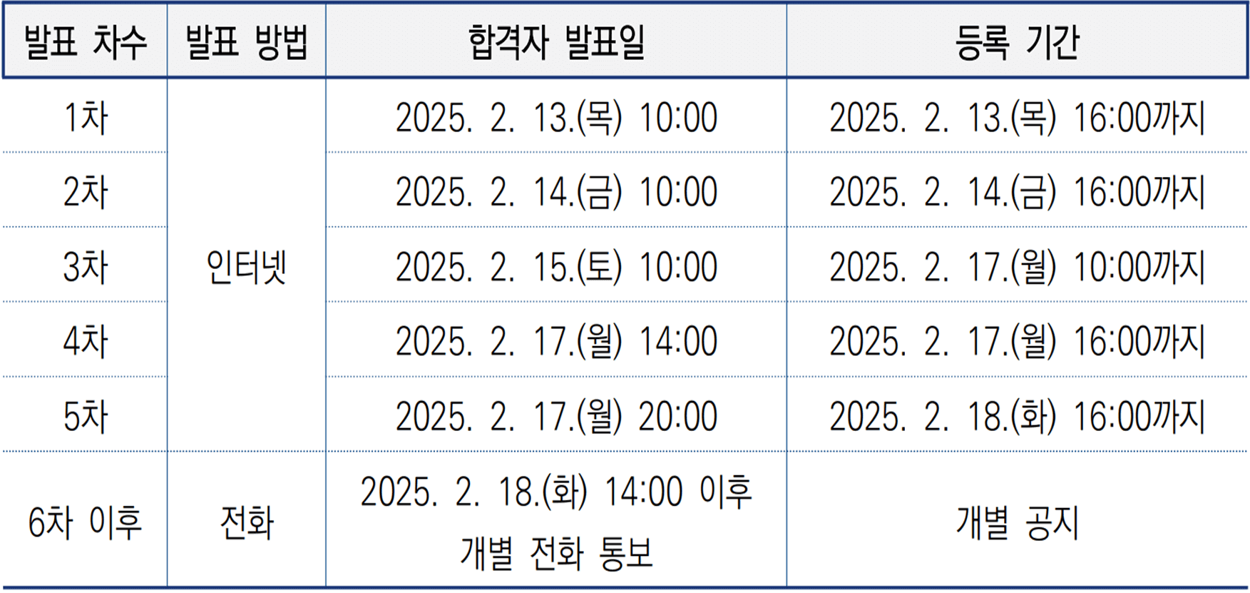 | 2025.02.13.(목) - 02.20.(목) 16:00 | 미등록 충원 등록 | 02.20.(목) 16:00까지 등록 마감이며, 02.20.(목)은 합격자 발표를 할 수 없음 |