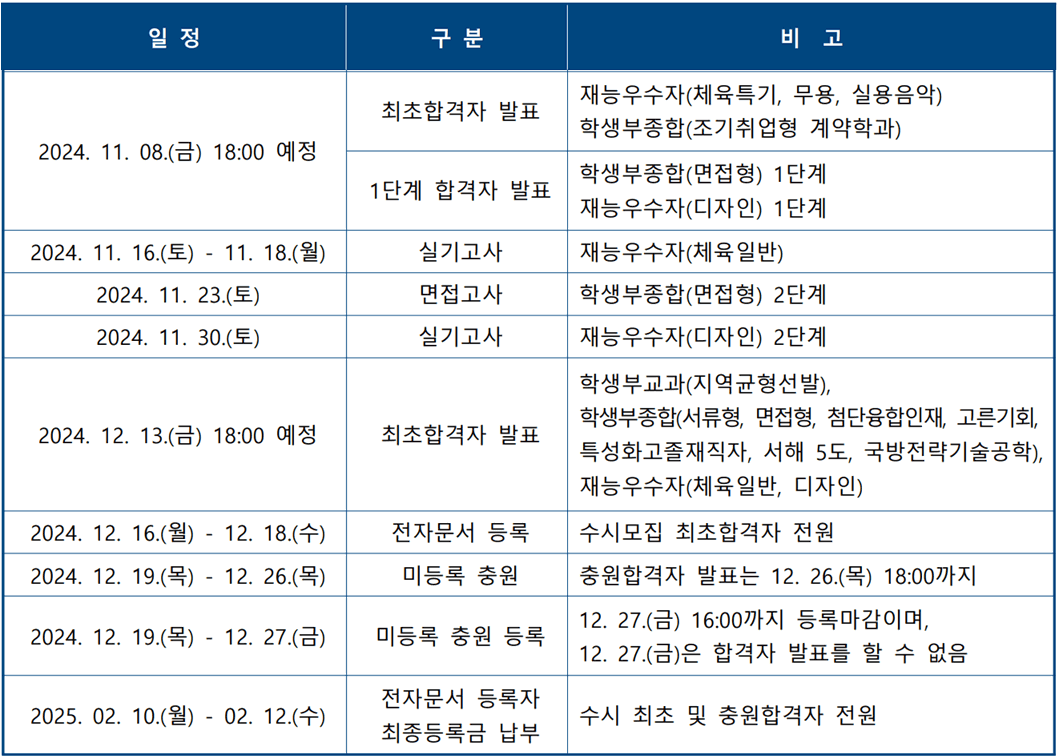 | 2025.01.17.(금) 18:00 예정 | 최초합격자 발표 | 가, 나군 일반전형(예체능계열 제외) |