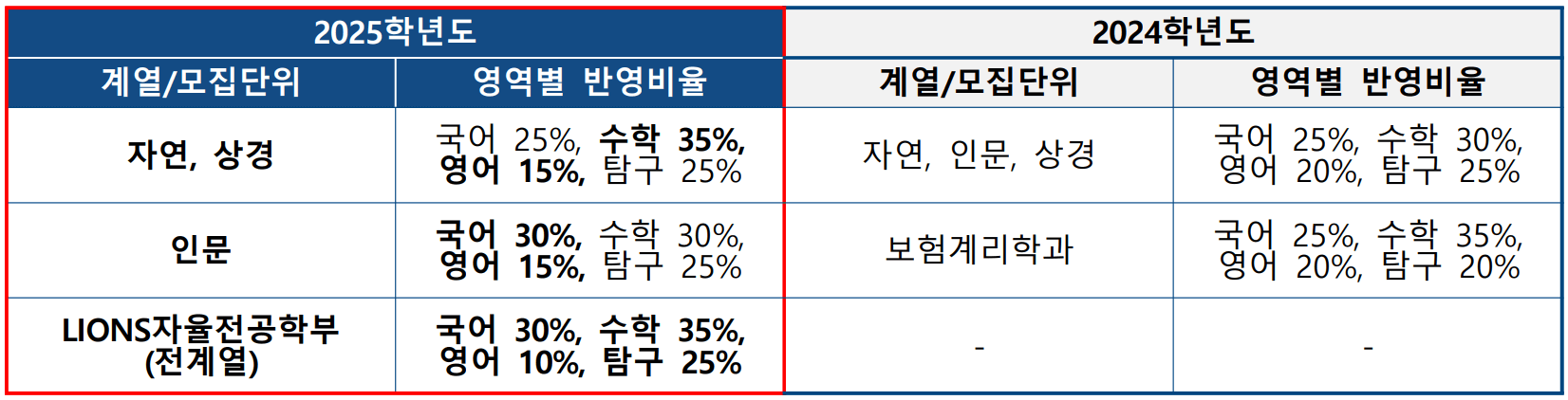① 자연1, 보험계리학과 : 과학탐구 과목당 가산점 3% 부여 ② 인문 : 사회탐구 과목당 가산점 3% 부여 ③ 자연2, 상경, 예체능, LIONS자율전공학부(전계열) : 가산점 없음 |