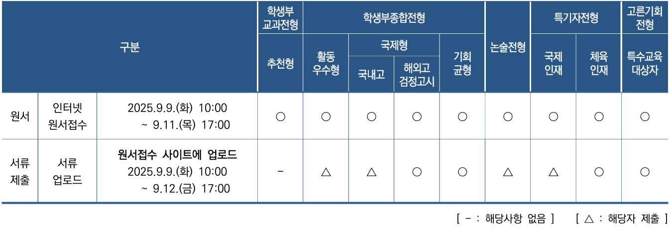 ※ 제출서류(해당자에 한함)는 원서접수 사이트( http://apply.jinhakapply.com )에 업로드해야 하며, 마감(2025.9.12.(금) 17:00 정각) 이후 업로드할 수 없고, 업로드된 서류는 변경할 수 없음. 세부 전형별 안내 페이지에서 ‘제출서류’를 반드시 확인 후 해당자의 경우 기한 내 업로드해야 함.